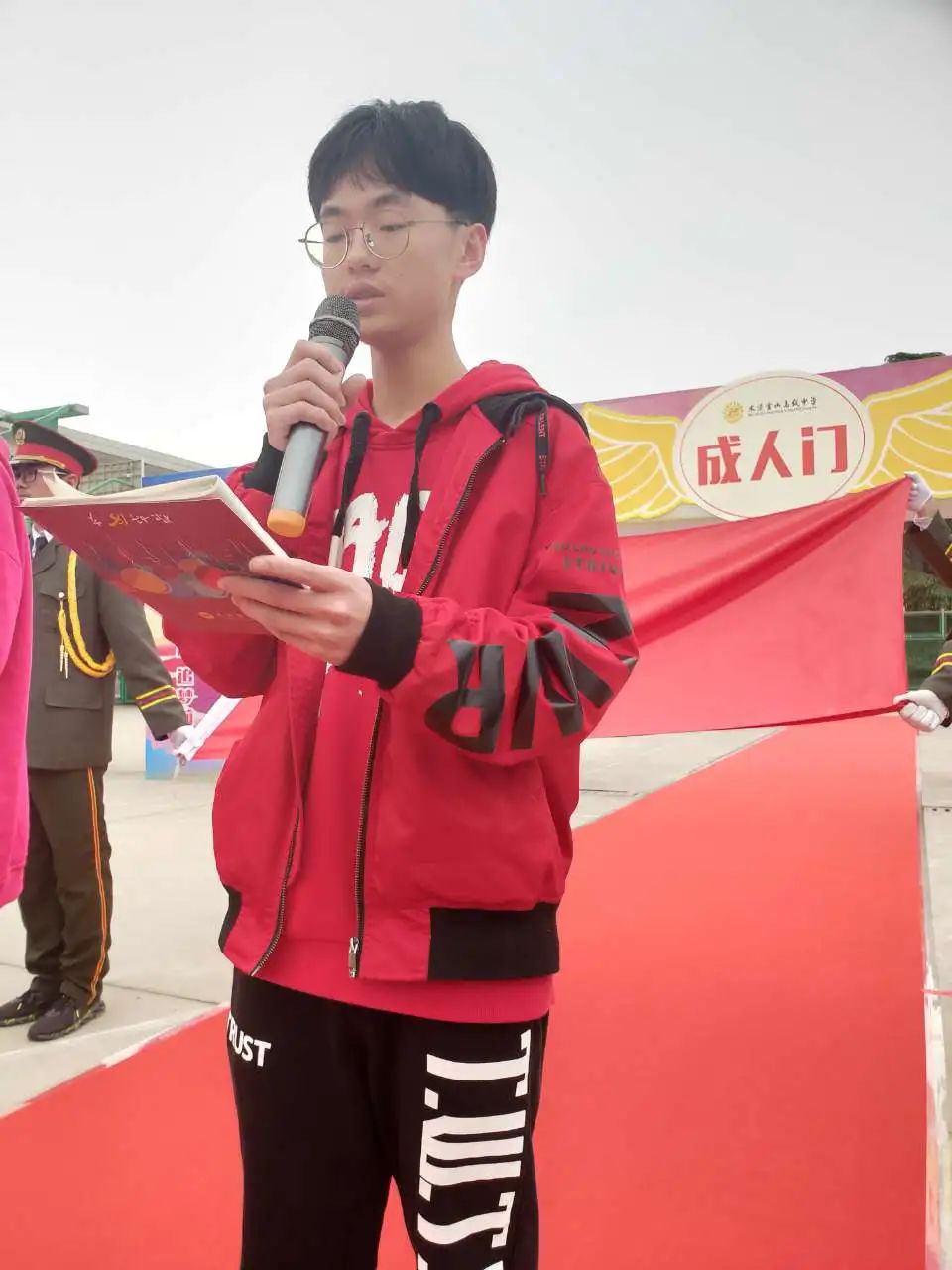 同学们右手握拳,举至耳际面对国旗庄严宣读成人誓词:“捍卫神圣宪法,维护法律尊严。履行公民义务,承担社会道义。国家昌盛为先,人民利益至上。热心奉献社会,无愧国家培育。勤勉奋发有为,不负人民厚望。以我火红青春,建设锦绣中华。以我壮志激情,创造崭新未来。”热情与刚毅的誓言声再次将会场的氛围点燃。