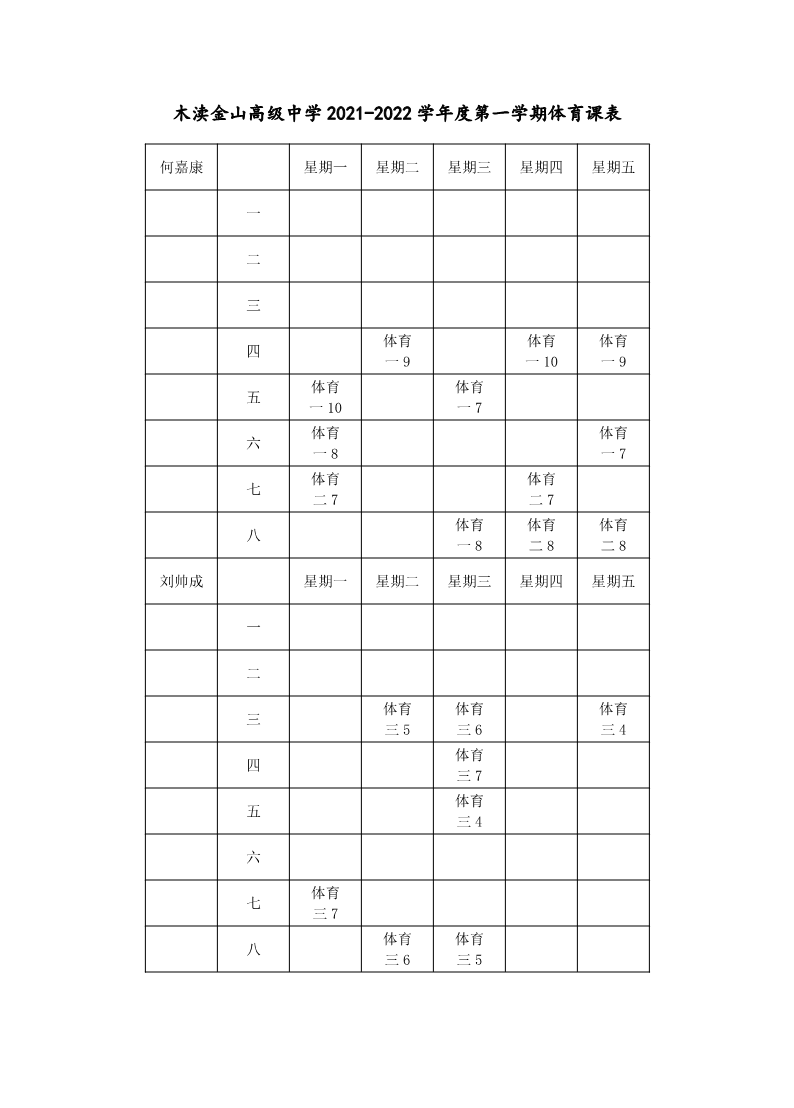 木渎金山高级中学2021-2022学年度第一学期体育课表