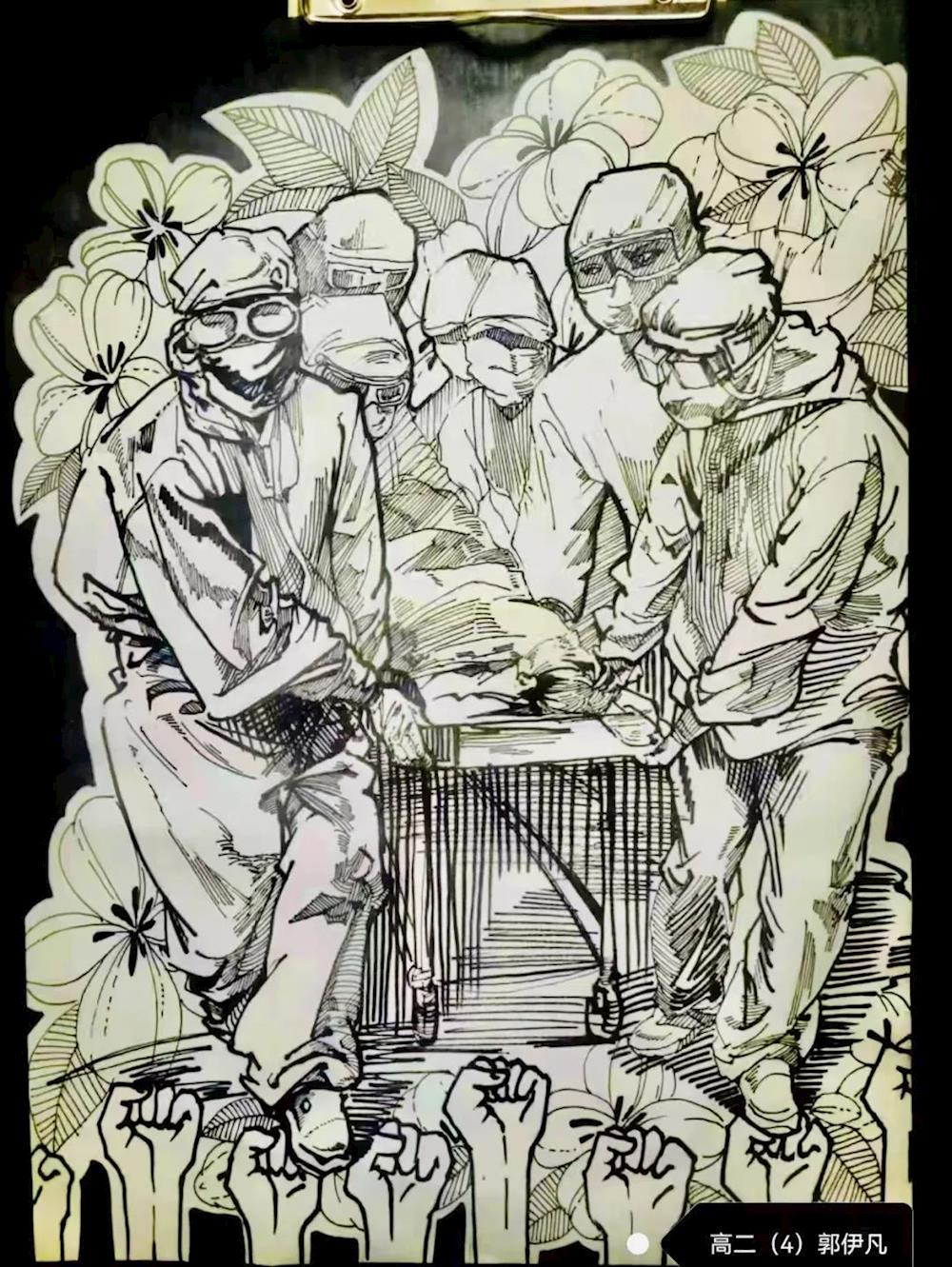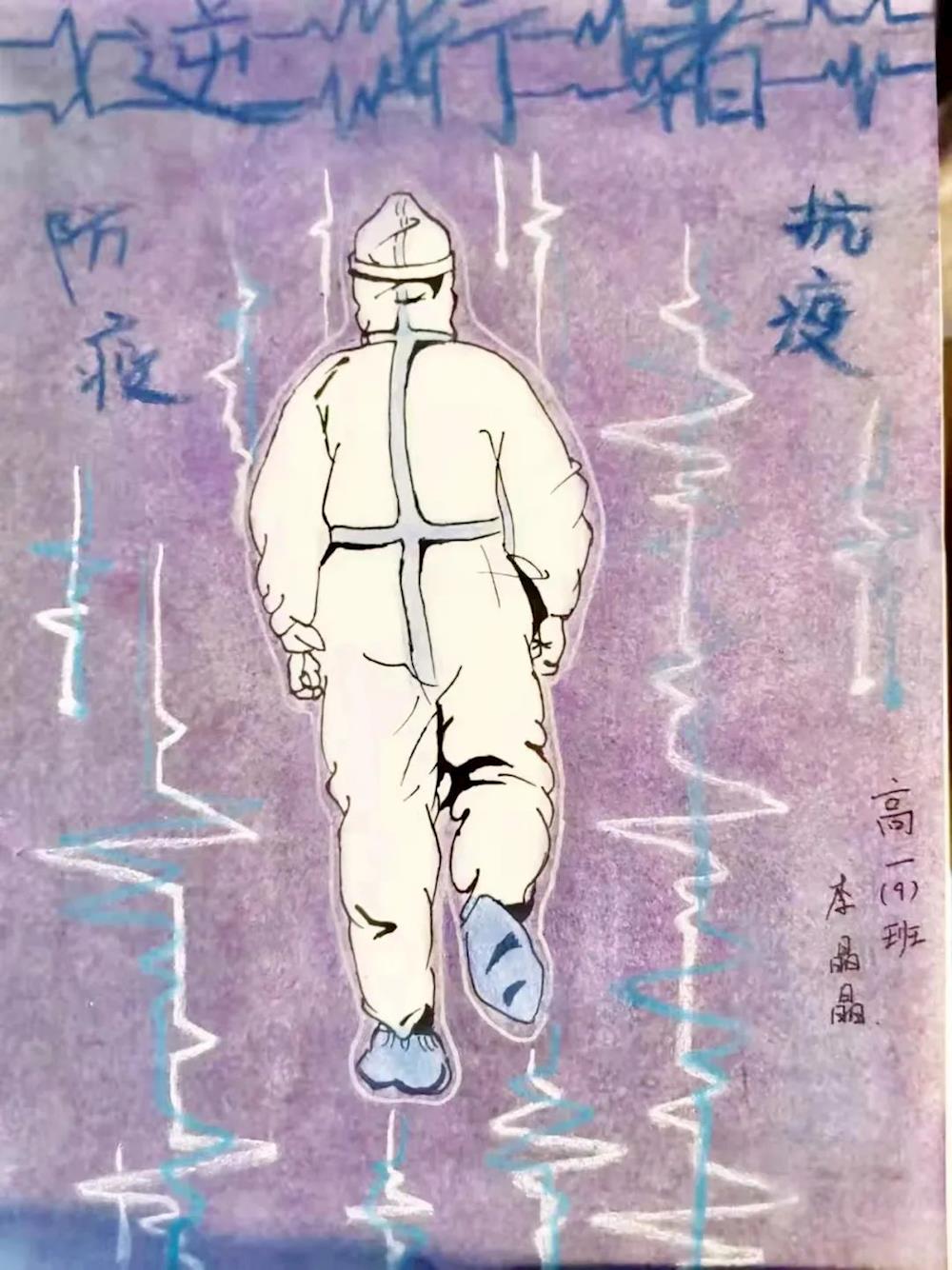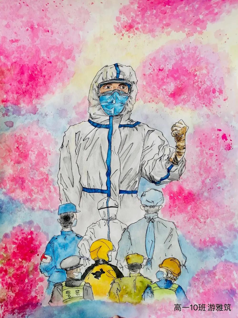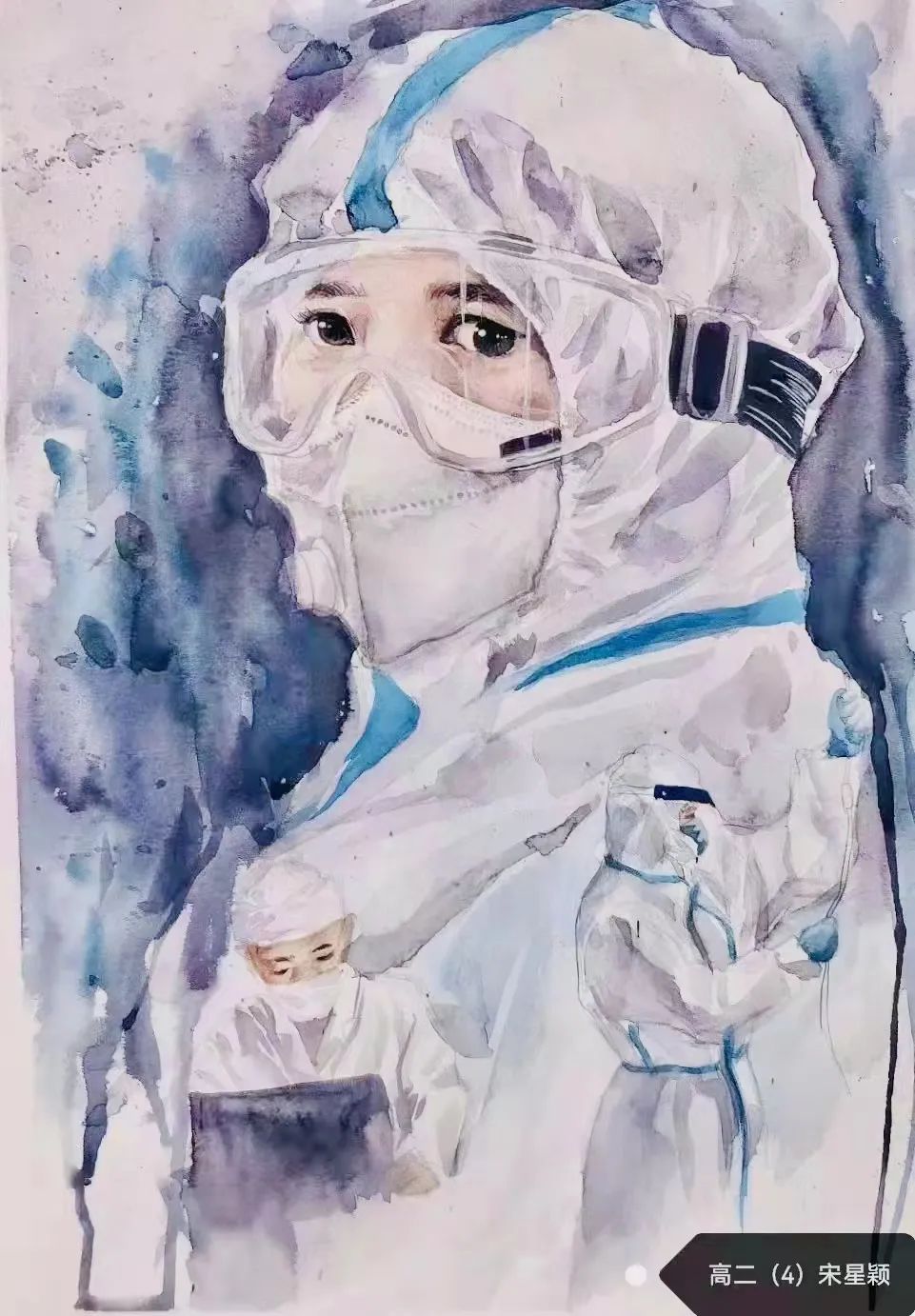 《众志成城》(高二4班 郭伊凡) 《致敬逆行者》(高二4班 宋星颖)