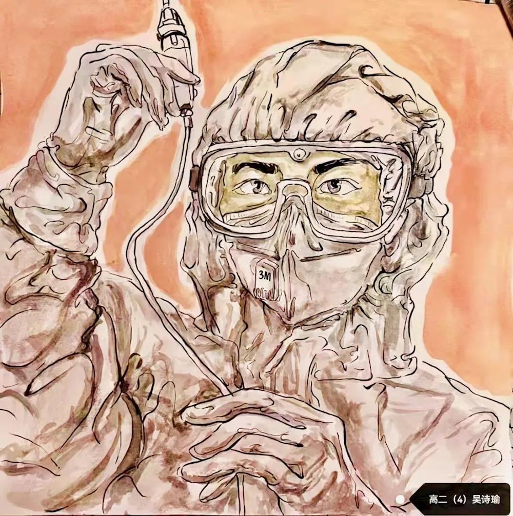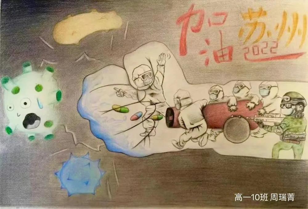 壬寅岁初,疫情袭苏,阴霾之下,共克时艰。这是一场没有硝烟的阻击战,有一份热,发一份光,点点萤火,汇成星河。线上学习之余,木渎金山高级中学师生的共同创作抗疫主题作品,以画致敬,用画卷向守护这座城市的最美逆行者致敬,也向与我们守望相助的同胞们致敬!以画传情,用画笔描绘白衣天使们勇毅的身影,用笔尖记录广大抗疫志愿者的辛勤。同时,也表达金山师生沉稳应对,同舟共济,“抗击疫情,为苏州加油”的决心。