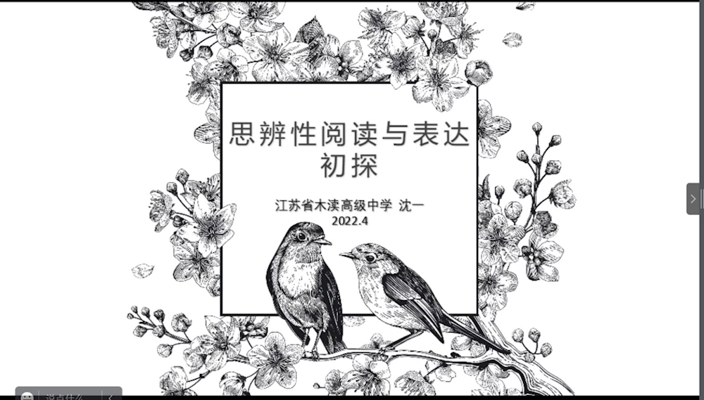 顾玲珍(甪直高级中学):在本次的名师工作室线上活动中,有幸聆听了沈老师和杨老师两位老师的微讲座,感受到了她们的“新课程、新理念、新思路”,对教育教学的探索与实践。沈老师的讲座《思辨性阅读与表达初探》,首先明确“思辨性阅读与表达”是普通高中语文课程标准、语文课程结构的重要内容,然后她从单篇教学、整本书阅读、群文阅读的角度具体谈了如何落实思辨性阅读与表达,特别强调“分析与实证是思辨性阅读的基本功”,给了我很大的启示。杨老师的《浅谈三新背景下高中语文作业设计》,通过作业的设计,培养学生创设情境,学会真实表达的能力;学会归纳总结,提高学生的思维品质。两位老师的讲座,为我以后的教育教学指明了方向,提供了非常好的借鉴。