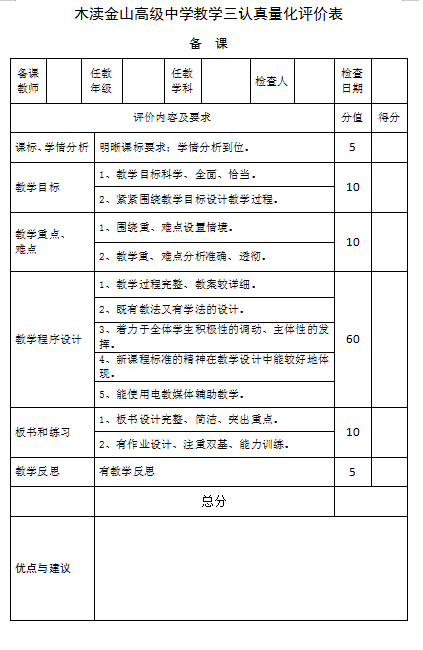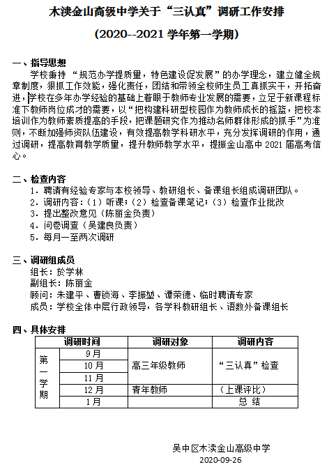 教学质量是学校的生命线,为有效提高师资队伍建设的整体水平,提高教育教学质量,近日来,木渎金山高级中学组成以於学林校长为组长,陈丽金校长为副组长的调研组,制定了完备的“三认真”调研工作安排表,先后多次组织教师进行听课评课教研以及教案评比活动。