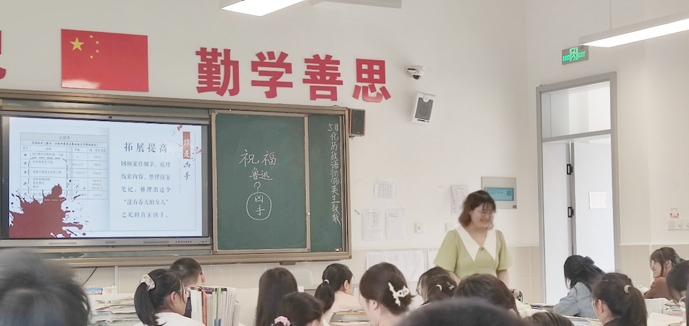 刘墨涵老师则以“剧本杀”的情境导入,她指导学生扮演不同角色,引导大家通过梳理情节寻找有价值的线索,一步步探究谜底,寻得杀害祥林嫂的真凶,揭示导致祥林嫂死亡的真凶——“吃人的封建社会”。