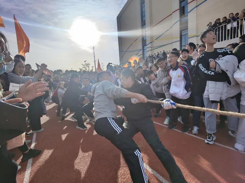 运动场上,运动员你追我赶,同学们之间的团结协作与奋勇争先在这里彰显得淋漓尽致,尤其是教师参赛的拔河比赛,热情的同学们甚至围到了跑道旁,喊破喉咙为老师们加油助威,当老师们团结协作最终获胜时,同学们的欢呼与激昂点燃了整个赛场。