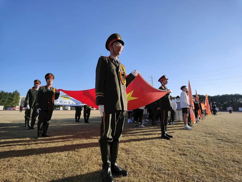 国旗伸展,校徽高擎,伴着激昂的音乐,踏着坚定的步伐,国旗护卫队列队严整、精神抖擞,率先走上赛道。